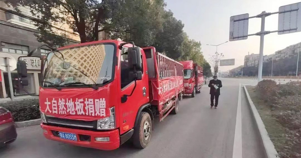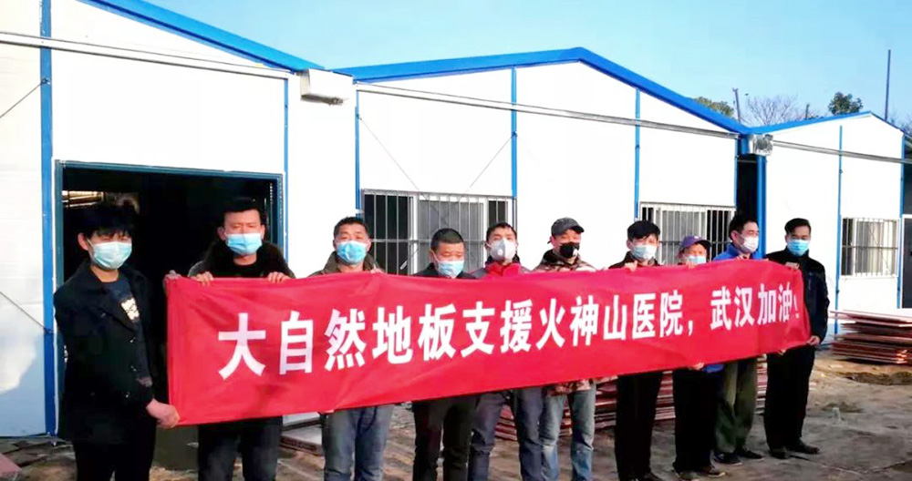 2020年初疫情之際,大自然家居緊急調動 臨近地板貨源,捐贈超過1100平方米的大 自然零醛智造強化地板,并召集武漢各區 運輸、安裝師傅20多名,以高效的執行力 為火神山醫院的建設添磚加瓦,用實際行 動踐行著“擔環保責任