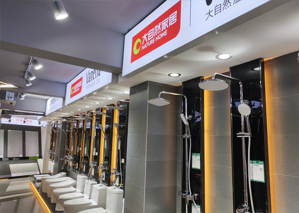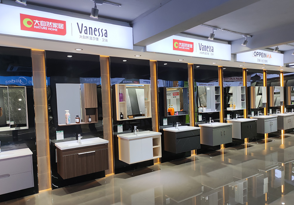 緣森泰裝飾位于中山市東區街道起灣道總部,已懸掛大自然家居和緣森泰裝飾“雙品牌”招牌。走進展廳,木門、浴室柜、衛浴、瓷磚等裝飾材料琳瑯盲目,品牌標識統一為“大自然家居”。