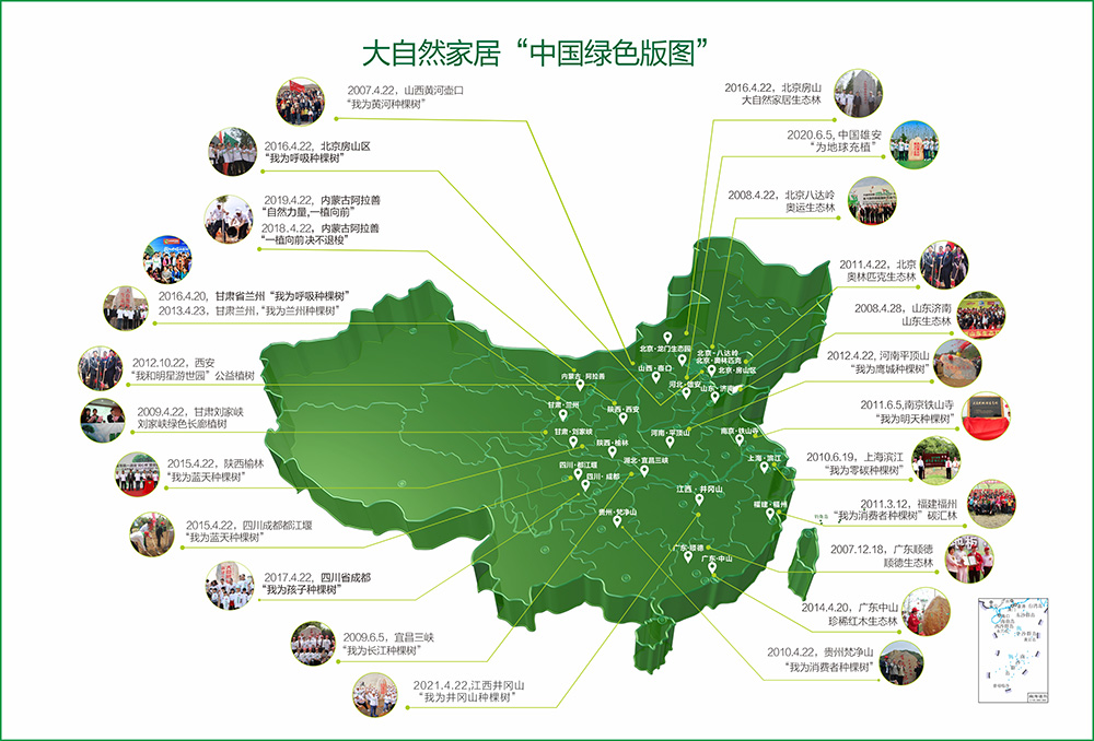 碳中和是一個持續的過程,大自然家居的碳中和腳步從未停下。大自然家居已堅持了15年公益植樹,遵守“砍一棵樹,種回十棵樹”的承諾,自2006年起,推出“中國綠色版圖工程”向中國綠化基金會累計捐資2000萬元,在國內外建成了25個公益生態林,植樹逾80萬棵,植樹面積超過102萬平方米,相繼開展了“我為黃河種棵樹”、 “我為零碳種棵樹”、“我為孩子種棵樹”、“我為藍天種棵樹”等公益植樹活動,通過種植生態林,使當地林業生態系統功能不斷完善,森林固碳釋氧、保持水土、調節氣候、保護生物多樣性等生態功能不斷增強。