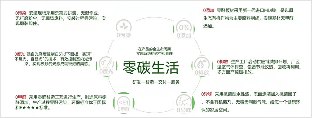 大自然家居2022年新品倡導零碳生活方式,力爭在產品的全生命周期實現系統的“碳中和”管理,順應“零碳消費”潮流而潛心研發新產品。0污染、0添加、0度光、0排放、0甲醛、0異味,這6個0將成為大自然家居2022年新品的標簽。