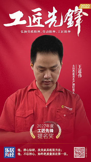 “2022工匠先鋒提名獎”也在現場揭曉,大自然家居生產部釘裝工王道偉獲得該榮譽。時代發展,需要大國工匠;邁向新征程,需要大力弘揚工匠精神。