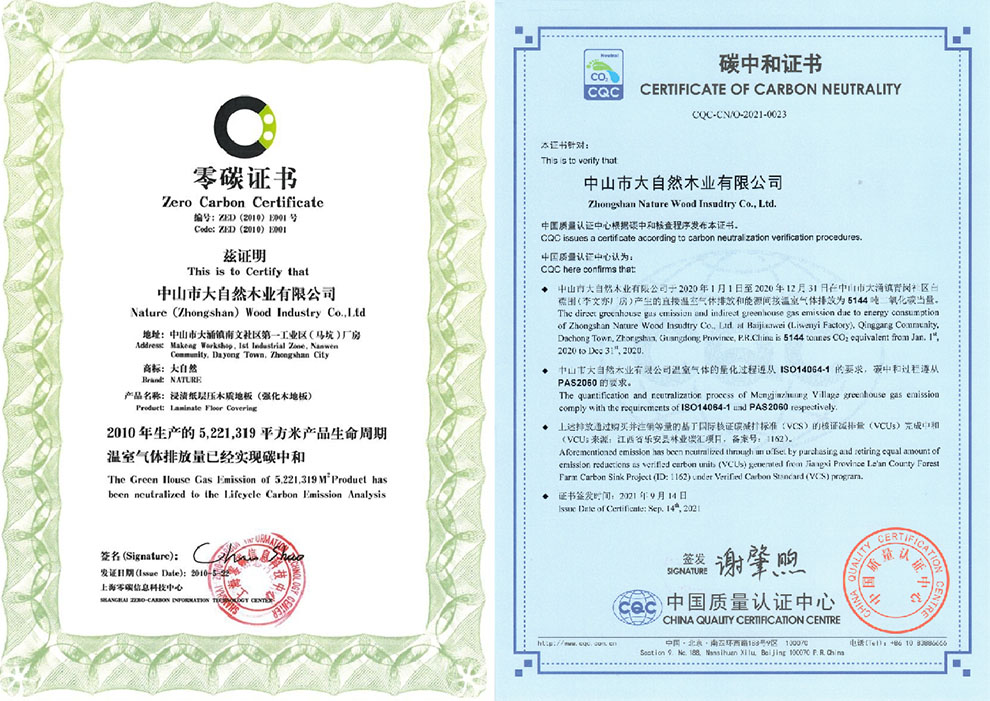 大自然家居始終堅持綠色低碳發展戰略。2021年9月14日,中國質量認證中心(CQC)向大自然家居頒發《碳中和證書》,標志著大自然家居成為行業首個實現碳中和的“燈塔”企業。早在2010年就推出了大自然“零碳”地板,通過采取改良生產工藝、優化物流布局、減少包裝材料等措施,實現生產過程碳排放量的控制與降低,獲得國際零碳專業委員會“碳中和”認證,同年鋪進了中國第一座零碳排放公共建筑——上海世博會零碳館。