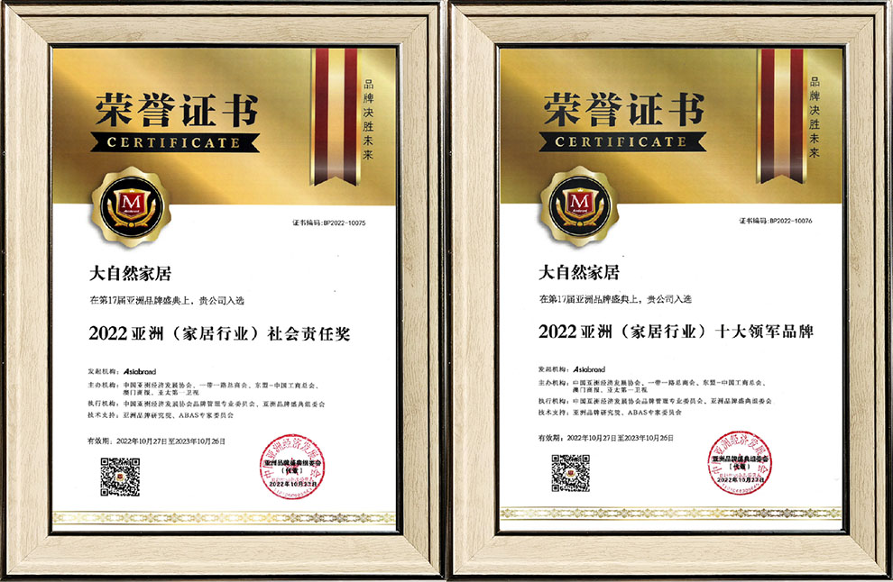 榮譽見證實力,當今競爭激烈的市場中,大自然家居能夠殺出重圍,獲得“2022亞洲品牌500強”、“2022亞洲(家居行業)社會責任獎”以及“2022亞洲(家居行業)十大領軍品牌”的認可,對企業來說意義重大。未來,大自然家居仍將堅持綠色環保的企業方針,持續探索不斷突破,積極響應國家“雙碳”戰略,視社會責任為己任,以智造構畫出家居行業更美好的未來。