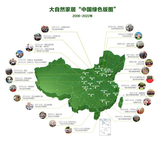 除此之外,為提高社會公眾造林綠化、改善生態環境的意識,自2006年起積極推進“中國綠色版圖工程”,大自然家居相繼開展了16年公益植樹活動。據相關數據統計,截至 2022年 5 月,在國內外 19 個地區種植了 27 片生態林,公益植樹超 100萬棵。與此同時,大自然家居攜手澳門紅十字會開展十年公益計劃、“中國綠色搖籃工程”公益助學等活動,以切身行動投身公益,為用戶打造健康、環保的生活方式。