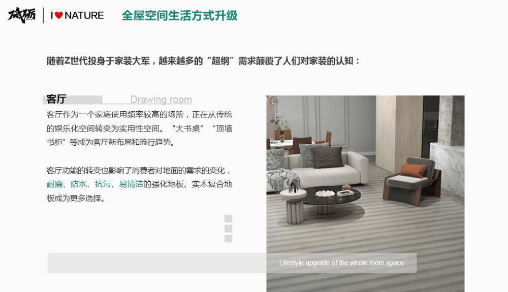 隨后,《2019粵港澳大灣區(qū)住宅精裝交付標(biāo)準(zhǔn)白皮書(shū)》主編、想象數(shù)科合伙人李可欣女士現(xiàn)場(chǎng)發(fā)布《2023綠色家居消費(fèi)趨勢(shì)白皮書(shū)》。白皮書(shū)中指出:隨著消費(fèi)者全空間的生活方式升級(jí),全屋通鋪木地板成為潮流趨勢(shì),重塑新時(shí)代家居空間。