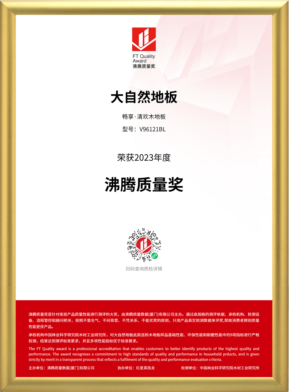 近日,2023年沸騰質量獎榜單揭曉,大自然家居旗下大自然地板暢享·清歡木地板(型號:V96121BL)憑借卓越品質實力,榮登榜單。